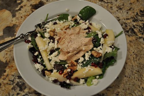 We ate the Big Salad with basic vinaigrette, goat cheese, pears, walnuts, and pomegranate seeds. I added cold leftover roast chicken as well. The key to keeping the Big Salad healthy is to go easy on the dressing and cheese (and no croutons).