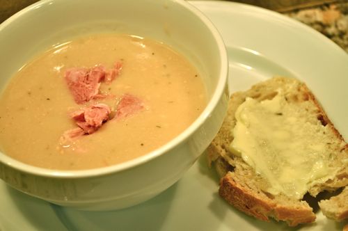 Rinse and inspect beans for rocks. I’ve recently learned (thanks, Mrs. Arnold!) that you don’t have to soak the beans overnight if you cook them all day in the crock pot. Put the beans in the crock pot with the onion, Salt-N-Pepa, ham bone, and rosemary, and then cover with chicken stock and water. Cook on low for 8-10 hours or longer. Remove all ham bone and onions, and puree beans with an immersion blender or food processor. Taste for Salt-N-Pepa (oh yes I did it again); you’ll probably need more salt. Add big hunks of leftover ham to serve.