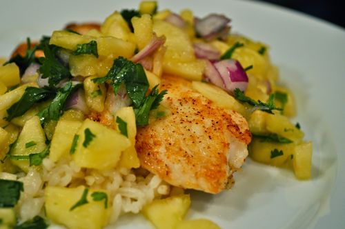 Chop pineapple, red onion, and cilantro and add lime juice and salt. Salsa is done and done. Make the salsa early in the day if you want and keep it in the fridge until dinner. Try really hard not to eat all the salsa with chips before dinner, though.