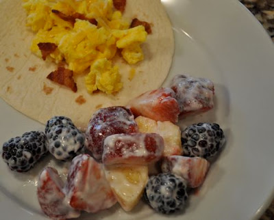 Cut up the bacon (I like to use scissors for this) and cook in a nonstick pan until crispy. Remove bacon and drain most of the oil from the pan, and scramble the eggs until done. Toss in a handful of cheese, stir it up. Serve eggs on warm tortillas and sprinkle with a little bacon.