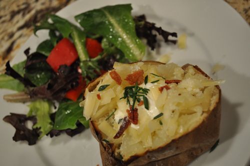 Anyway, we had baked potatoes for dinner with salads.  Do I need to print a recipe?  Bake potatoes in the oven for an hour.  Eat.  Oh, and if you live in my house, don’t be the last one to get the bacon or your won’t have much.  We like bacon around here.