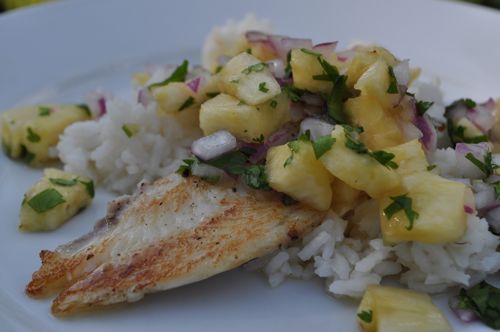 Thaw fish and pat dry with paper towel. Sprinkle with salt and pepper. Cook in HOT nonstick skillet drizzled with olive oil on one side until it’s brown, about 2-3 minutes. Flip fish and cook the other side, another 2-3 minutes. Remove cooked fish from pan, turn off heat, add butter, and juice of half a lemon.  Place tilapia on top of rice, pour over lemon butter, and top with pineapple salsa.