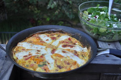 I love frittatas because you can really add most any meat, vegetables, and cheese you have to some eggs and call it dinner.  Tonight, it was bacon, fresh tomatoes, green onions, orange peppers, and mozzarella cheese.  We also had an arugula salad with my favorite honey vinaigrette, goat cheese, and almonds.