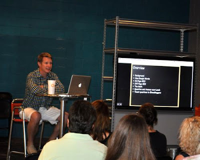 Here’s my brilliant husband, completely in his element, talking about one of his favorite subjects, Google analytics.  If you come to our house at any given time, you’ll find him sitting exactly like this (without the big screen, although I’ll bet he wishes he had one connected at home).  Here’s a link to his presentation, if you missed it.