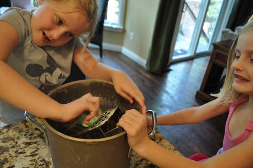 Yep, I got the idea of making homemade laundry soap from the Duggars, but I’ve since learned that a lot of regular people make it, too. Because we do 1-2 loads of laundry every DAY around here, we go through a lot of Tide, so I thought we’d give it a try. I also thought it would be a good super hot day activity for the kids…