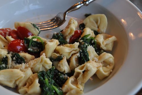 Boil the water and cook the tortellini for about 5 minutes (for refrigerated tortellini, longer for the frozen). Meanwhile, heat skillet to medium high and add about 1/2 tablespoon of olive oil. Add the garlic and red pepper flakes, cook for 2 minutes, and then add spinach and salt and pepper. Cook the spinach until it’s wilted (about 2-3 minutes), and add tomatoes and stir. Turn off the heat. Drain tortellini and toss it together with one tablespoon of butter and spinach/tomato mixture. Season with Parmesan cheese.