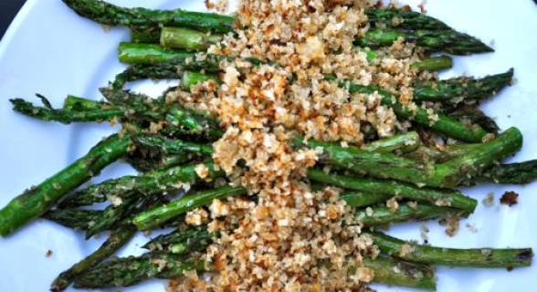 After the Garlic Parmesan Edamame yesterday, I got to thinking about what else I could cover in buttery breadcrumbs. Yum. How about asparagus? Yes!