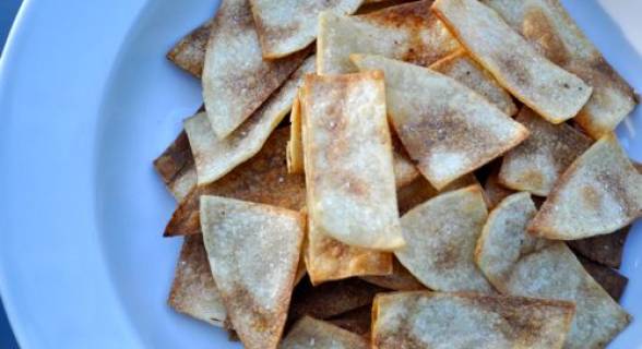Lightly brush each tortilla with canola oil using a pastry brush. Cut the tortillas into triangles, sprinkle with kosher salt, and bake at 400 for 8-10 minutes, or until crispy.