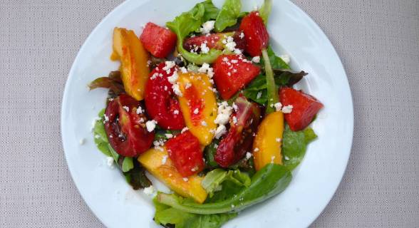 Cut the tomatoes, peaches, and watermelons into the same size chunks. Mix with vinaigrette, and serve over salad greens. Top with crumbled queso fresco.