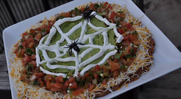 Spread the beans on the bottom of a serving dish. Next, add the grated cheese around the edge. Add the pico de gallo, and then the guacamole. Pipe the sour cream in a spiderweb pattern using a plastic bag (put the sour cream in a Ziploc and cut off the corner). Add some plastic spiders. Serve with tortilla chips.